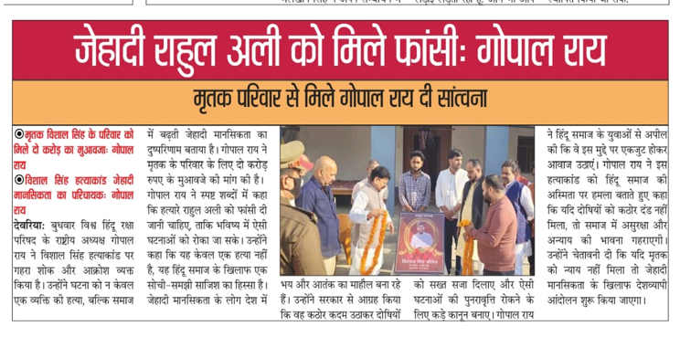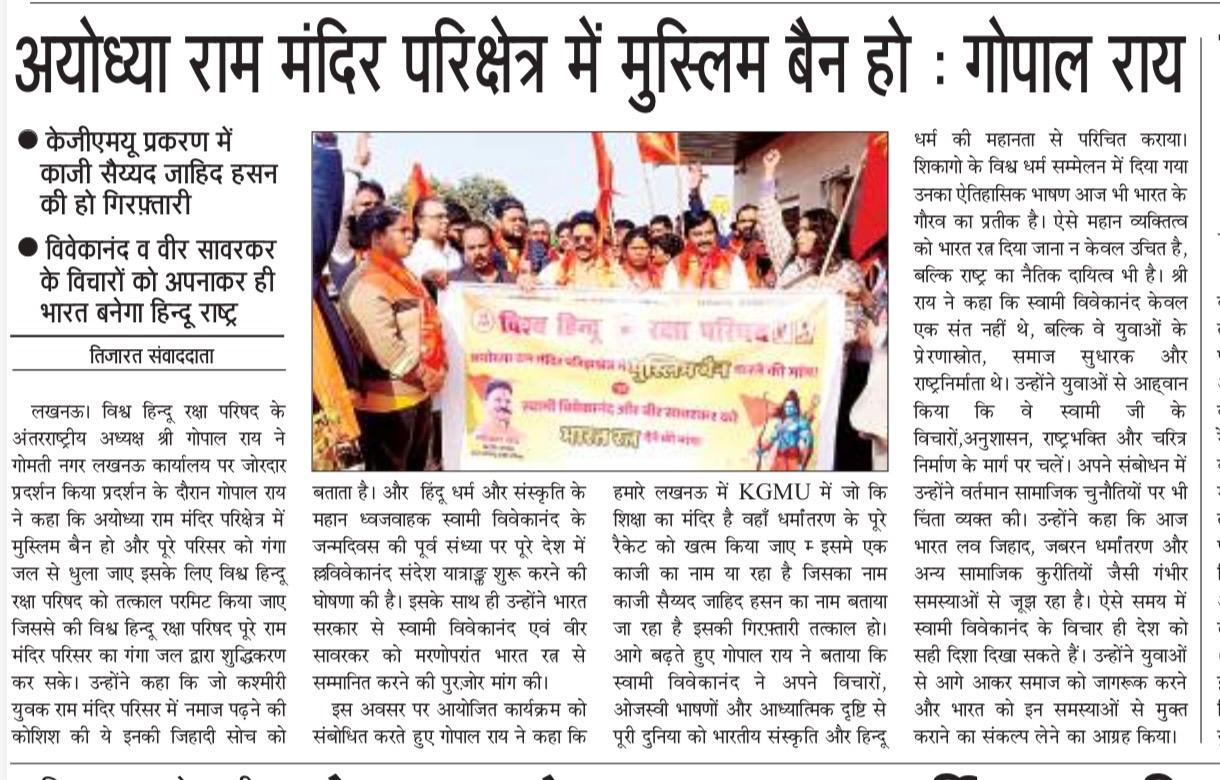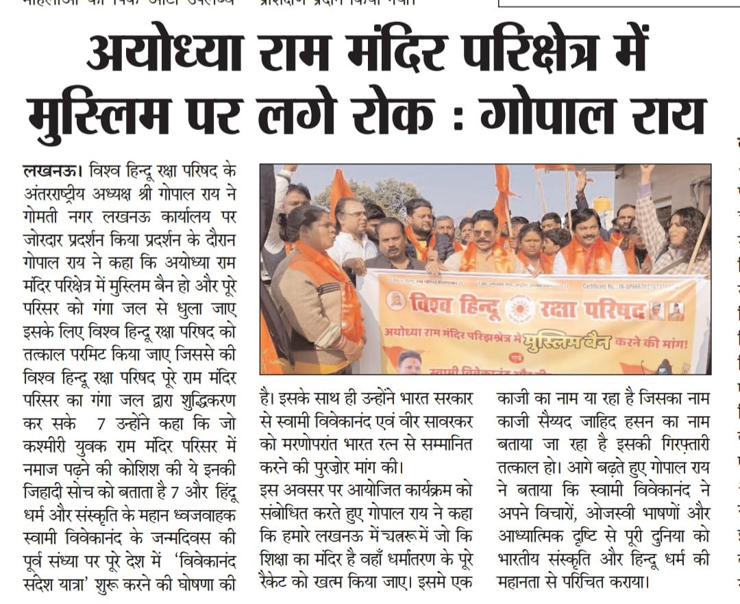 लखनऊ रविवार l विश्व हिन्दू रक्षा परिषद के अंतरराष्ट्रीय अध्यक्ष श्री गोपाल राय ने गोमती नगर लखनऊ कार्यालय पर जोरदार प्रदर्शन किया प्रदर्शन के दौरान गोपाल राय ने कहा की अयोध्या राम मंदिर परिक्षेत्र में मुस्लिम बैन हो और पूरे परिसर को गंगा जल से धुला जाए इसके लिए विश्व हिन्दू रक्षा परिषद को तत्काल परमिट किया जाए जिससे की विश्व हिन्दू रक्षा परिषद पूरे राम मंदिर परिसर का गंगा जल द्वारा शुद्धिकरण कर सके | उन्होंने कहा कि जो कश्मीरी युवक राम मंदिर परिसर में नमाज पढ़ने की कोशिश की ये इनकी जिहादी सोच को बताता है |