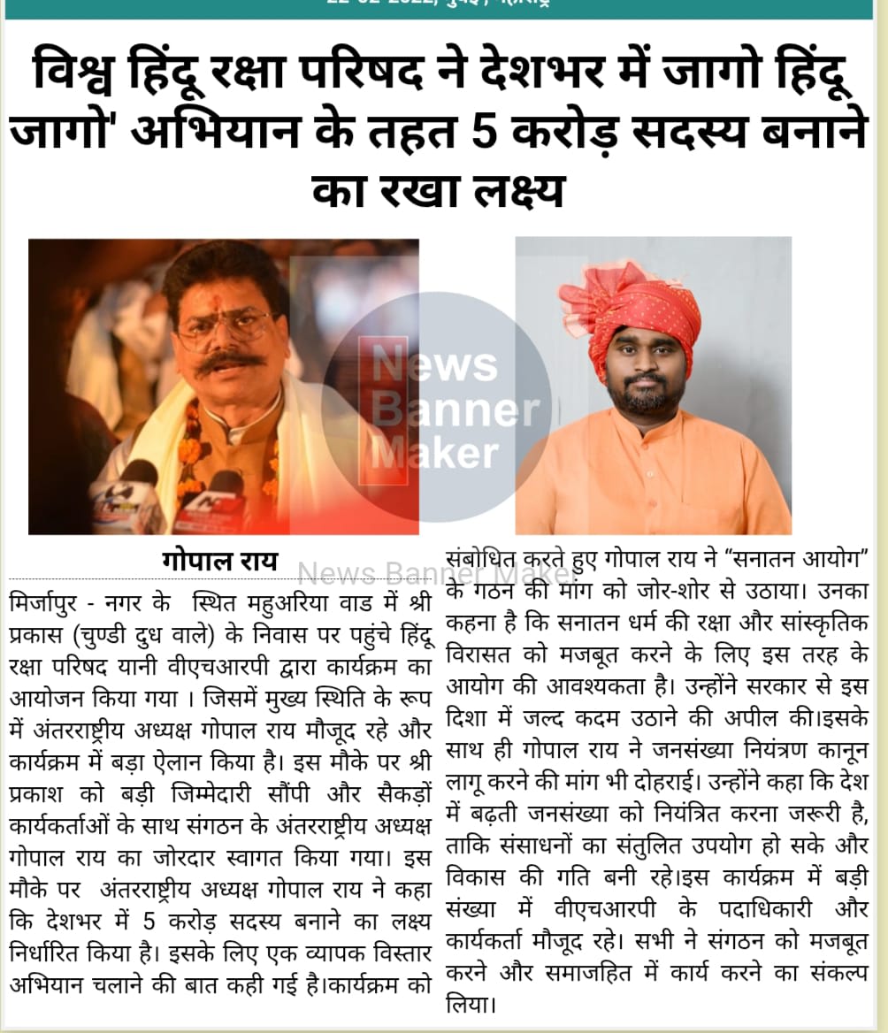 विश्व हिंदू रक्षा परिषद ने देशभर में जागो हिंदू जागो' अभियान के तहत 5 करोड़ सदस्य बनाने का रखा लक्ष्य